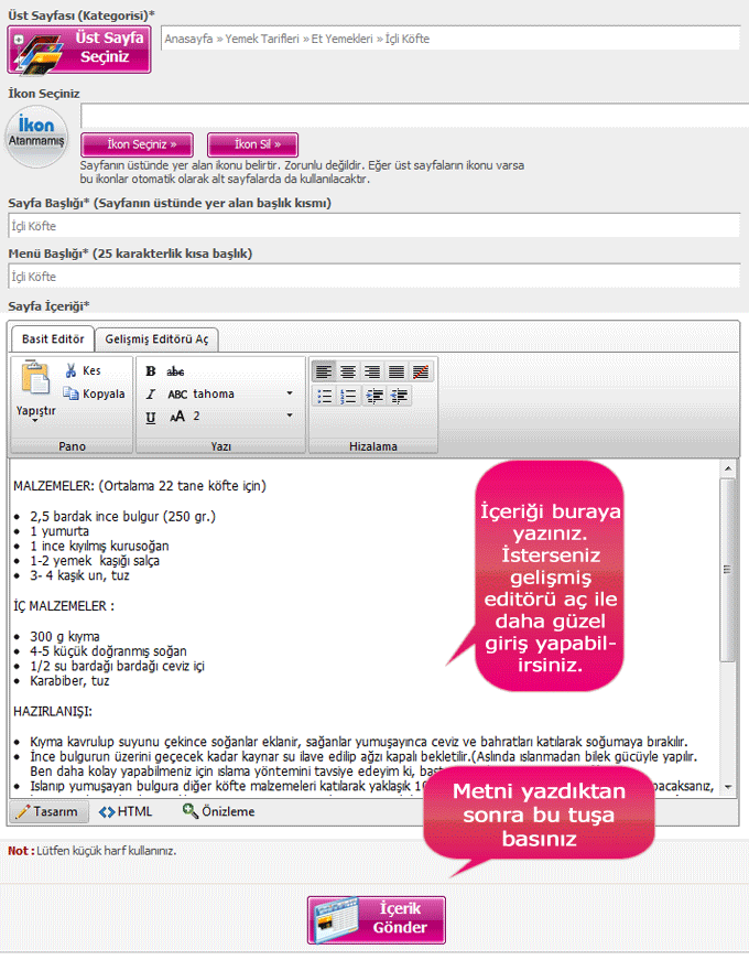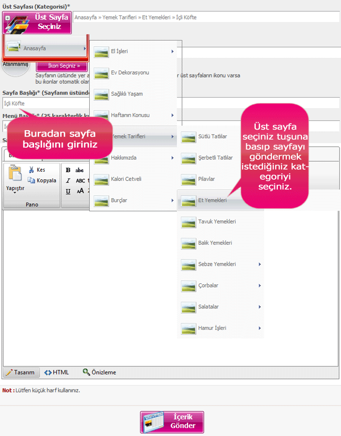 Bundan sonra karþýnýza Ek Ýçerik Gönderim Sayfasý gelecektir. Bu sayfada önce Üst Sayfa Seçiniz yazan yerden sayfayý göndermek istediðimiz kategoriyi seçiyoruz. Biz þuan bir yemek tarifi gönderdiðimiz için yemek tarifleri kategorisinden et yemeklerini seçiyoruz. Yanlýþ seçildiði zaman sonradan düzeltme imkaný vardýr.