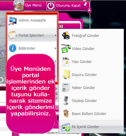 Üye giriþi yaptýktan sonra üye menüden portal iþlemlerine geliniz. Sonra buradan resimde görüldüðü gibi Ek Ýçerik Gönder menüsünü seçiniz.