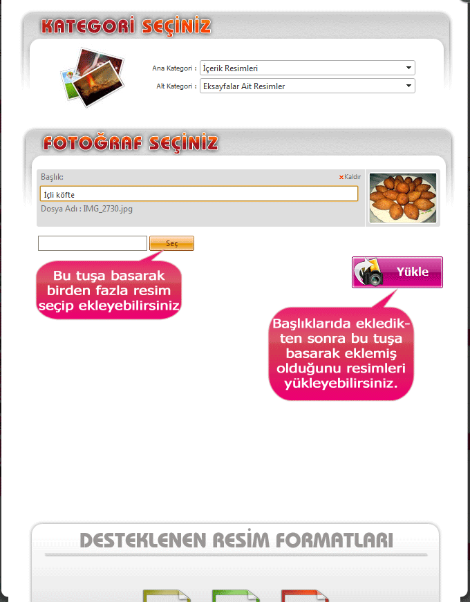 Fotoðraf Gönder tuþuna bastýktan sonra bir pencere açýlacaktýr. Bu pencereden ekle tuþuna basarak bilgisayarýnýzda veya telefonunuzdan fotoðraflarý seçebileceðiniz bir ekran gelecektir.  Ayný anda klayeden CTRL tuþuna basýlý tutarak birden fazla fotoðraf seçebilirsiniz. Seçilen fotolar hemen aktarýlacak ve önizlemeleri gelecektir. Önizlemenin yanýndaki baþlýk kutusuna fotoðrafýn baþlýðýný girip sonra yükle tuþuna basarsanýz bu fotoðraflar içerik sayfasýyla iliþkilendirilecektir.